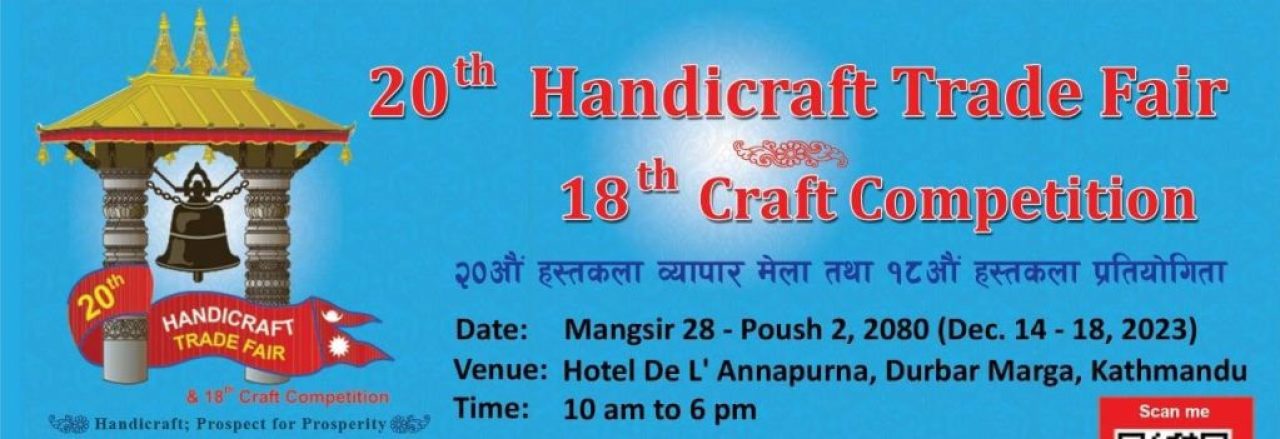 काठमाडौं । नेपाल हस्तकला महासंघले बर्सेनि आयोजना गर्दै आइरहेको ‘हस्तकला व्यापार मेला तथा हस्तकला प्रतियोगिता’ यस वर्ष मंसिर २८ गतेबाट हुने भएको छ । यसअघि मुलुकको अवस्थाका कारण स्थगित मेला मंसिर २८ गते बुधबारदेखि पाँच दिनसम्म राजधानीको दरबारमार्गस्थित अन्नपूर्ण होटल परिसरमा हुनेछ ।