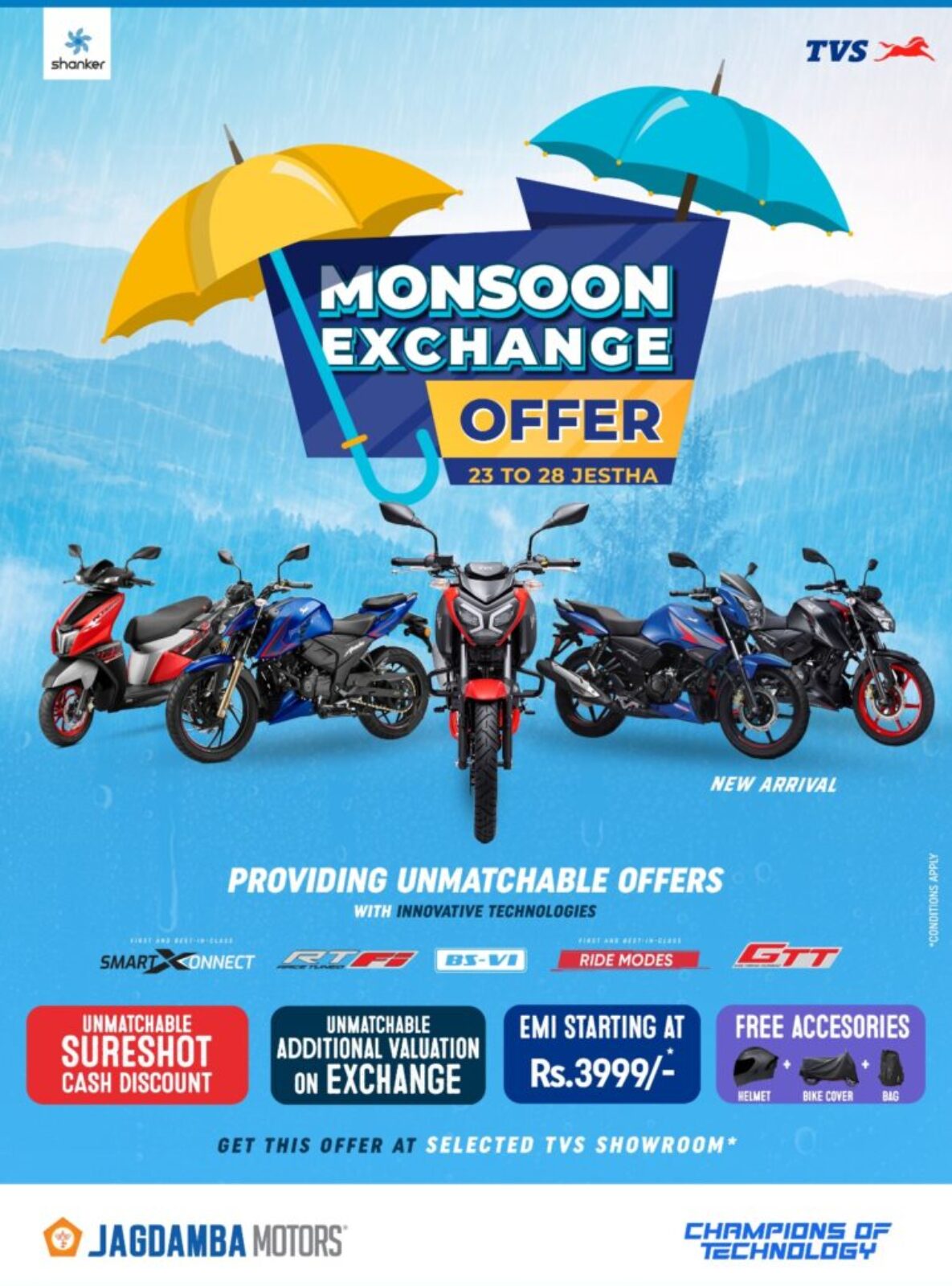 जगदम्बा मोटर्सले ल्यायो टिभिएस मोटरसाइकलमा अफरसहितको ‘मनसुन एक्सचेन्ज’