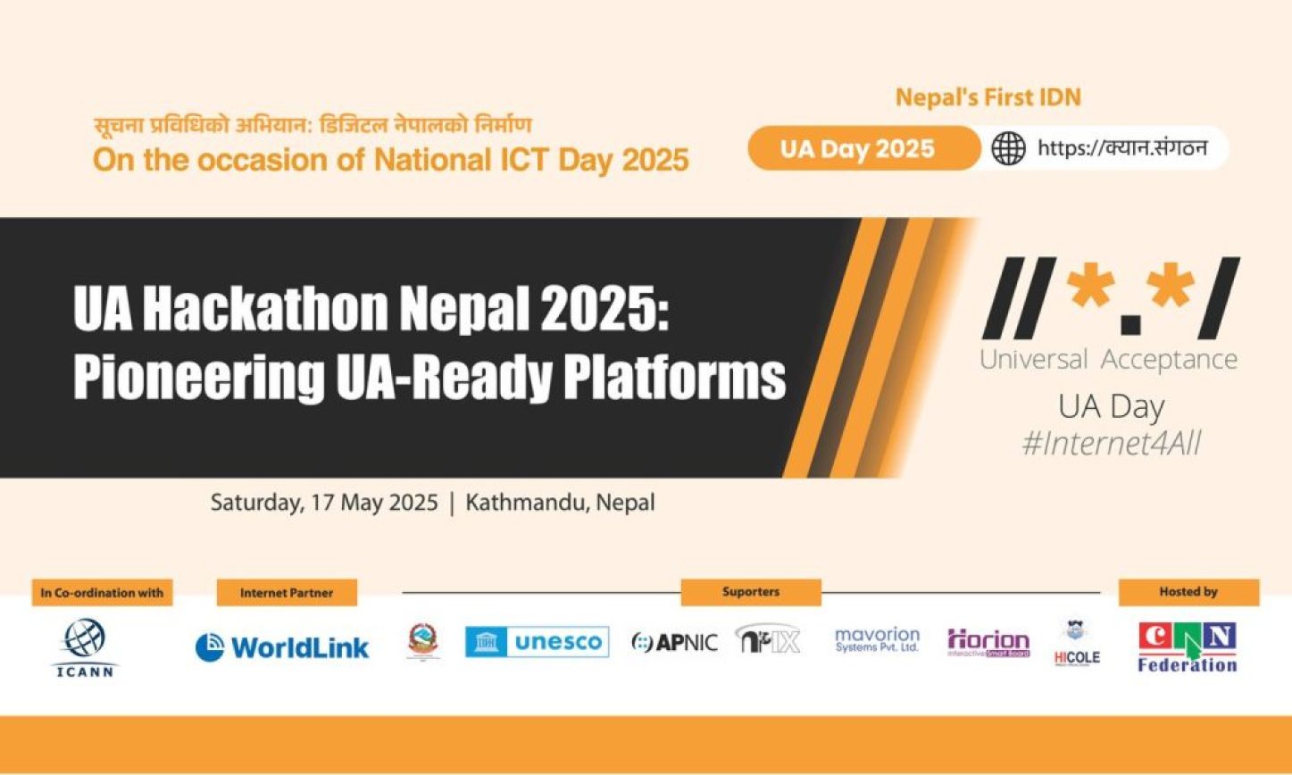 काठमाडौं । नेपाली भाषामा डोमेन प्रयोग गरिएको पहिलो वेबसाइट ‘क्यान.संगठन’ सार्वजनिक गर्दै युनिभर्सल एक्सेप्टेन्स (यूए) ह्याकाथन नेपाल २०२५ सम्पन्न भएको छ । कम्प्युटर एसोसिएसन नेपाल महासंघ (क्यान महासंघ) र अन्तर्राष्ट्रिय संस्था आईक्यान (ICANN) को सहकार्यमा शनिबार काठमाडौंमा आयोजना गरिएको ‘UA Hackathon Nepal 2025: Pioneering UA Ready Platforms’ कार्यक्रमले इन्टरनेट पहुँचमा समावेशिता र नेपाली भाषाको प्रवर्द्धनमा ऐतिहासिक पाइला चालेको हो ।