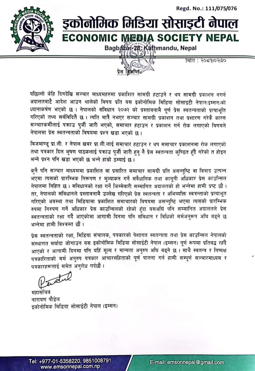 विज्ञप्तिमा बिजमाण्डु प्रालि र नेपाल खबर प्रालि लाई समाचार हटाउन तथा थप प्रकाशनमा रोक लगाइएको र पत्रकार दिलभुषण पाठकमाथि पक्राउ पुर्जी जारी गरिनु प्रेस स्वतन्त्रता प्रतिको आक्रमणसरह भएको ठहर गरेको हो ।