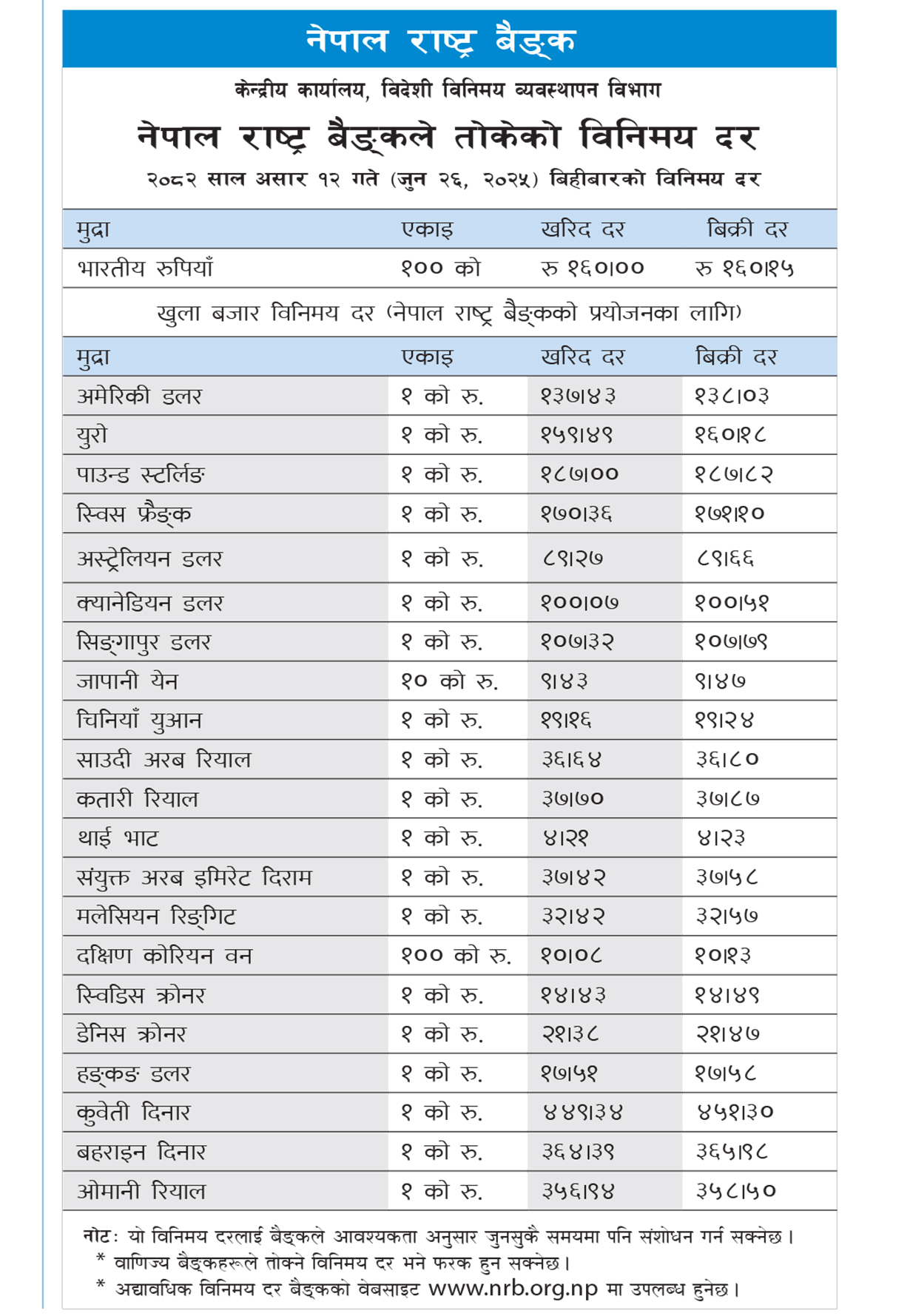 हेर्नुहोस् नेपाल राष्ट्र बैंकले आज निर्धारण गरेको विदेशी मुद्राको विनिमयदर