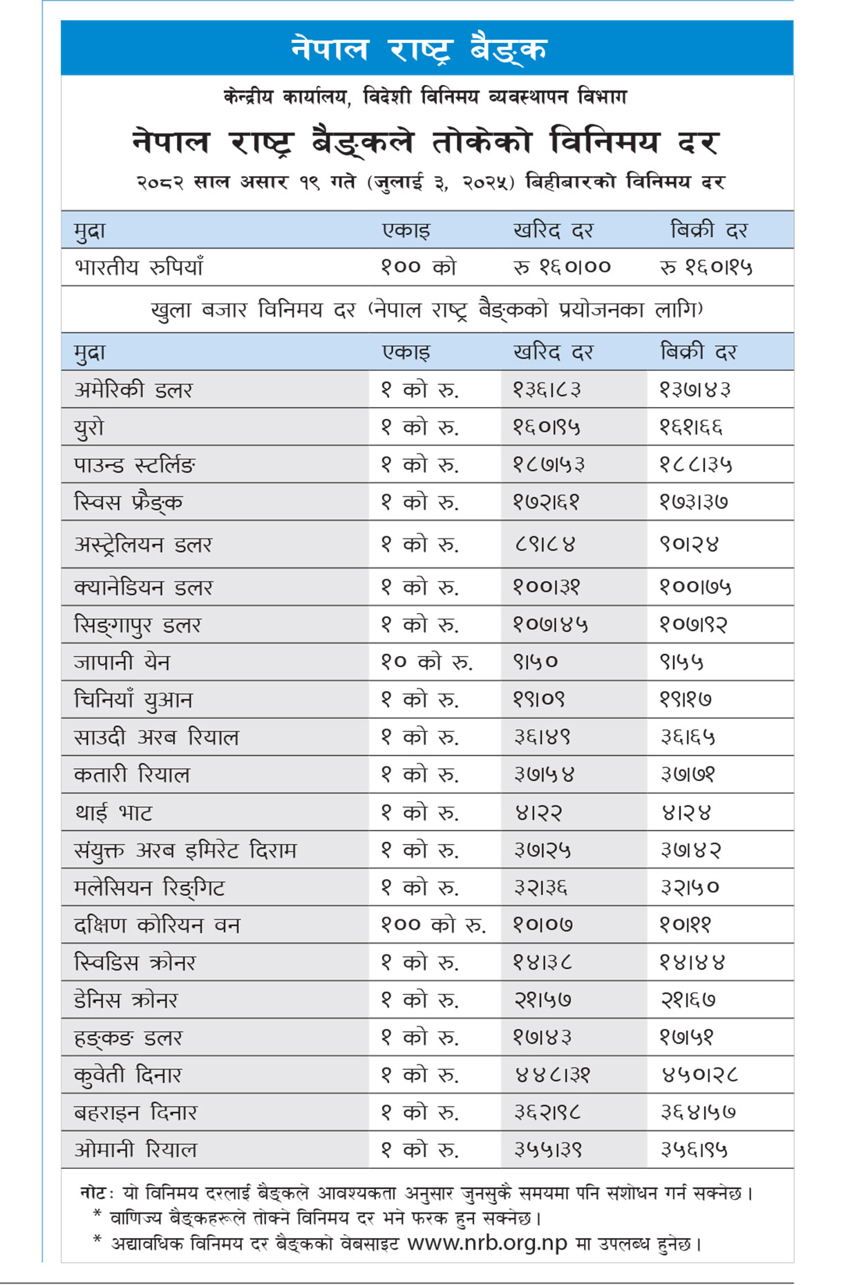 जापानी येन १० को खरिददर नौ रुपैयाँ ५० पैसा र बिक्रीदर नौ रुपैयाँ ५५ पैसा, चिनियाँ युआन एकको खरिददर १९ रुपैयाँ ०९ पैसा र बिक्रीदर १९ रुपैयाँ १७ पैसा, साउदी अरेबियन रियाल एकको खरिददर ३६ रुपैयाँ ४९ पैसा र बिक्रीदर ३६ रुपैयाँ ६५ पैसा, कतारी रियाल एकको खरिददर ३७ रुपैयाँ ५४ पैसा र बिक्रीदर ३७ रुपैयाँ ७१ पैसा कायम भएको छ ।