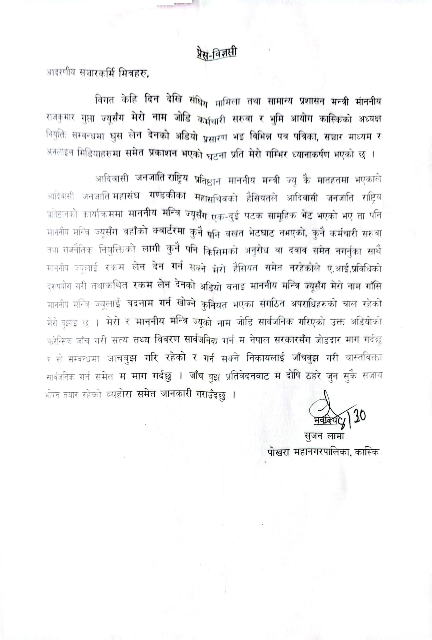 यस्तै, सुुजन लामाले कार्यक्रमहरूबाहेक मन्त्री गुप्तासँग भेटघाट नै नभएको बताएका छन् । ‘आदिवासी जनजाती राष्ट्रिय प्रतिष्ठान माननीय मन्त्रीज्यूकै मातहतमा भएकाले महासंघको महासचिवको हैसियतले महासंघकै कार्यक्रमहरूमा एक–दुई पटक भेट भएको हो,’ लामाले आफ्नो विज्ञप्तिमा लेखेका छन्, ‘तर मन्त्रीज्यूको क्वार्टरमा कुनै पनि बखत भेटघाट नभएको, कुनै कर्मचारी सरुवा तथा राजनीतिक नियुक्तिका लागि अनुरोध, दबाब वा आर्थिक लेनदेन गर्नसक्ने मेरो हैसियत नै होइन ।’