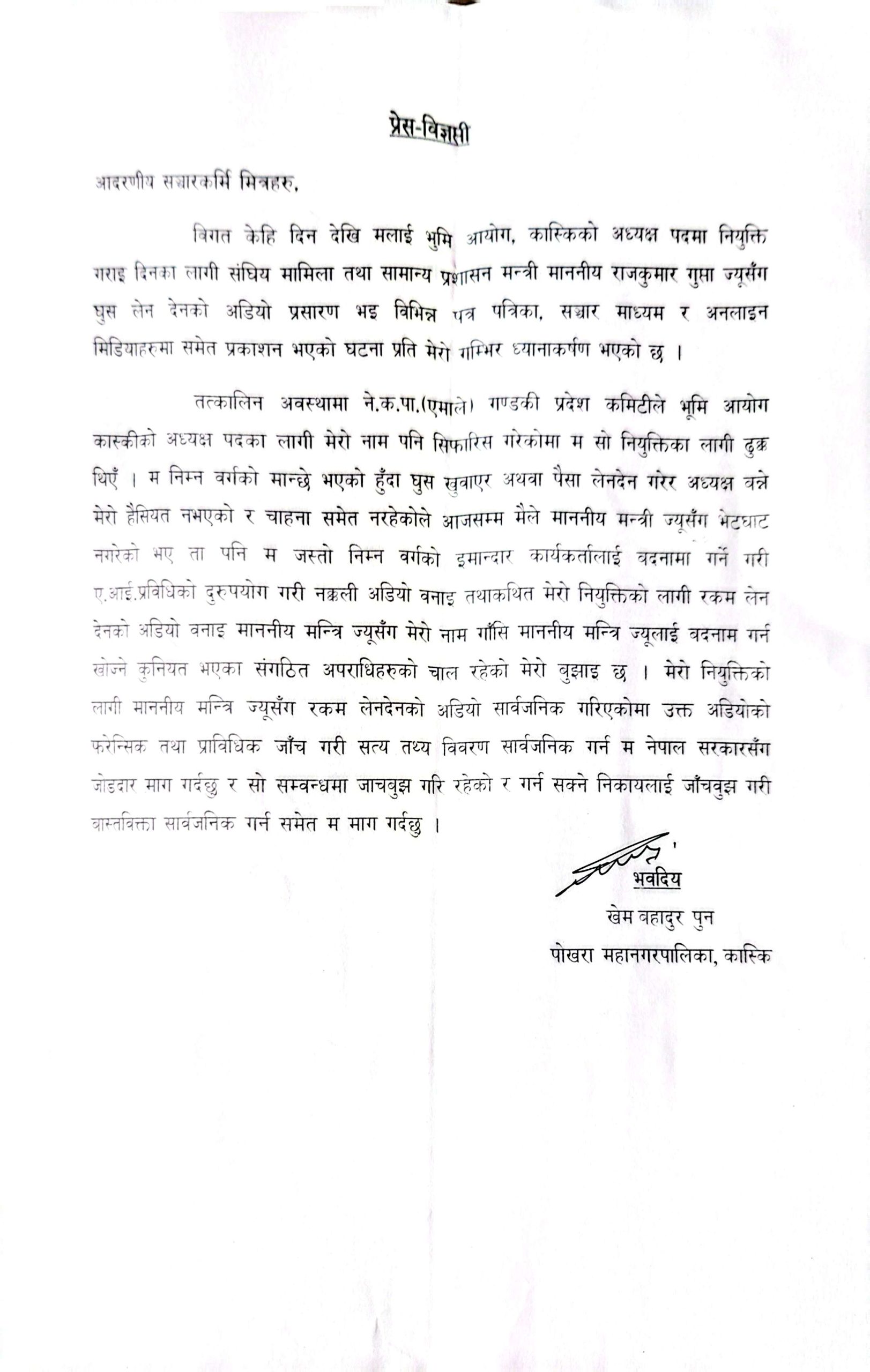 तत्कालीन अवस्थामा नेकपा एमाले गण्डकी प्रदेश कमिटीले भूमि आयोग कास्कीको अध्यक्ष पदका लागि आफ्नो नाम सिफारिस गरेकोमा सो नियुक्तिका लागि ढुक्क रहेको तथा आफू निम्न वर्गको मान्छे भएको हुँदा घुस खुवाएर अथवा पैसा लेनदेन गरेर अध्यक्ष बन्ने आफ्नो हैसियत र चाहनासमेत नभएको खेम पुनले जारी गरेको विज्ञप्तिमा उल्लेख छ ।