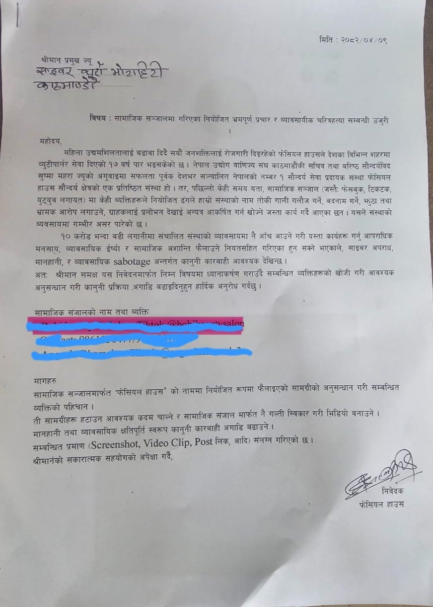 फेसियल हाउसबारे भ्रम फैल्याउने विरुद्ध साइबर ब्युरोमा उजुरी, प्रतिव्यक्ति १० करोड रुपैयाँ जरिवाना माग