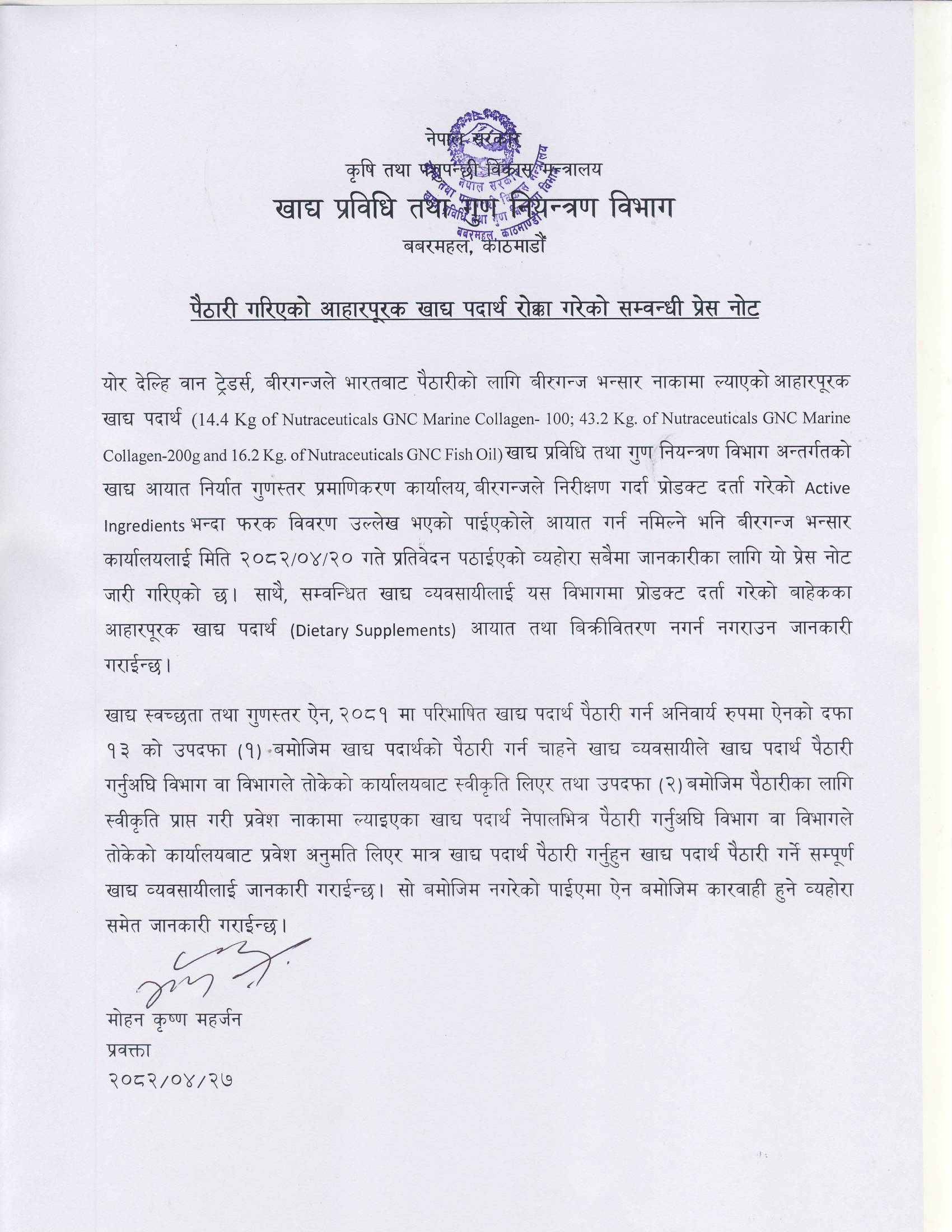 कार्यालयका अनुसार योर देल्हि वान ट्रेडर्स, बीरगन्जले ल्याएको GNC Marine Collagen (१०० ग्रामका १४.४ केजी र २०० ग्रामका ४३.२ केजी) तथा GNC Fish Oil (१६.२ केजी) मा दर्ता गरिएको Active Ingredients भन्दा फरक विवरण उल्लेख गरिएको पाइयो।