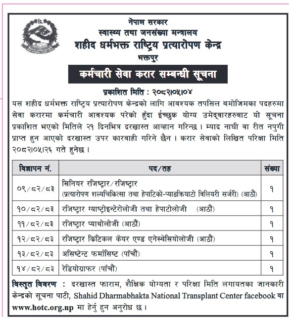 सहीद धर्मभक्त राष्ट्रिय प्रत्यारोपण केन्द्रले माग्यो करार सेवामा ६ कर्मचारी