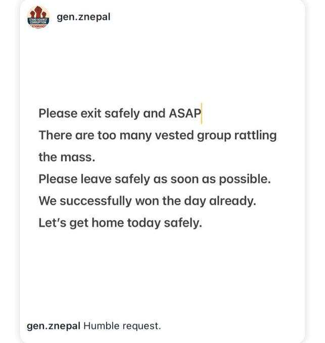 यसअघि आन्दोलनको बारेमा पोस्ट गर्दै आएको पेजमा लेखिएको सूचनामा भनिएको छ, ‘कृपया तत्कालै सुरक्षित तरिकाले निस्किनुहोला । धेरै स्वार्थ प्रेरित समूहहरुले भिडलाई उत्तेजित बनाइरहेका छन् । चाँडोभन्दा चाँडो त्यहाँबाट हट्नुस् । हाम्रो आजको दिन सफल भइसकेको छ । आज सबै जना सुरक्षित तरिकाले घर जानुस् ।’