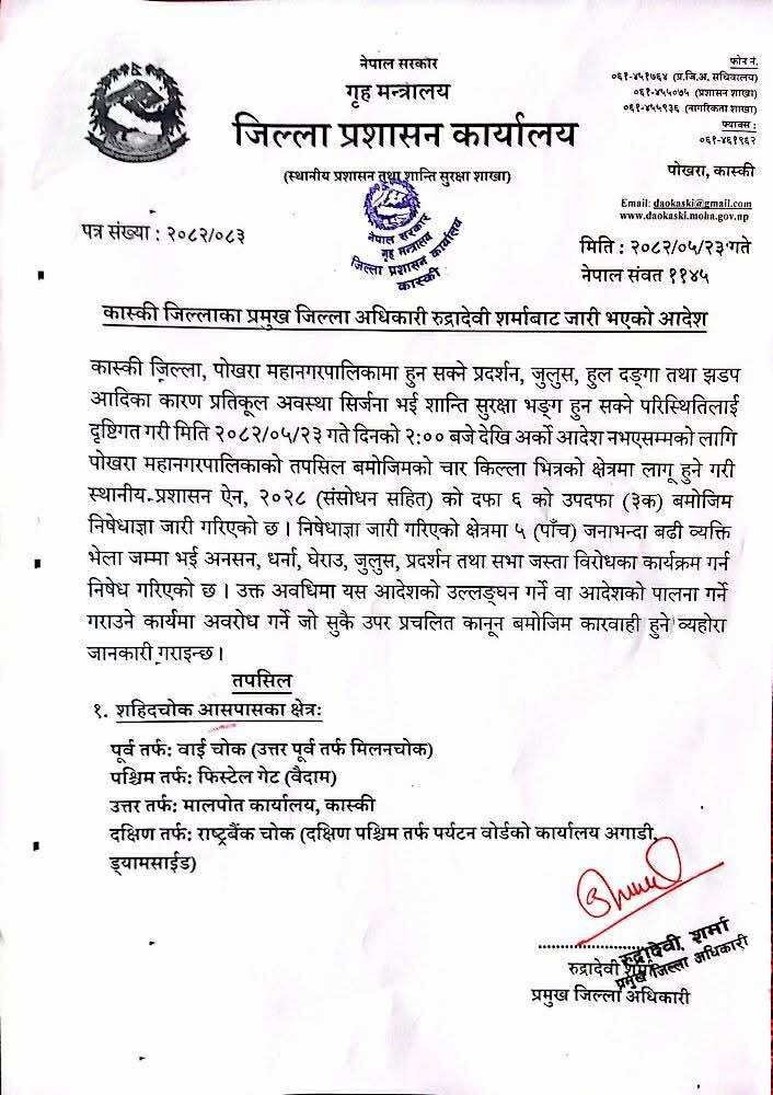 पोखरा । जेनजी आन्दोलन चर्किँदै गएपछि पोखरामा पनि स्थानीय प्रशासनले कर्फ्यु लगाएको छ । प्रमुख जिल्ला अधिकारी रुद्रदेवी शर्माले सोमबारदेखि लागु हुने गरी कर्फ्यु आदेश जारी गरेकी हुन् ।