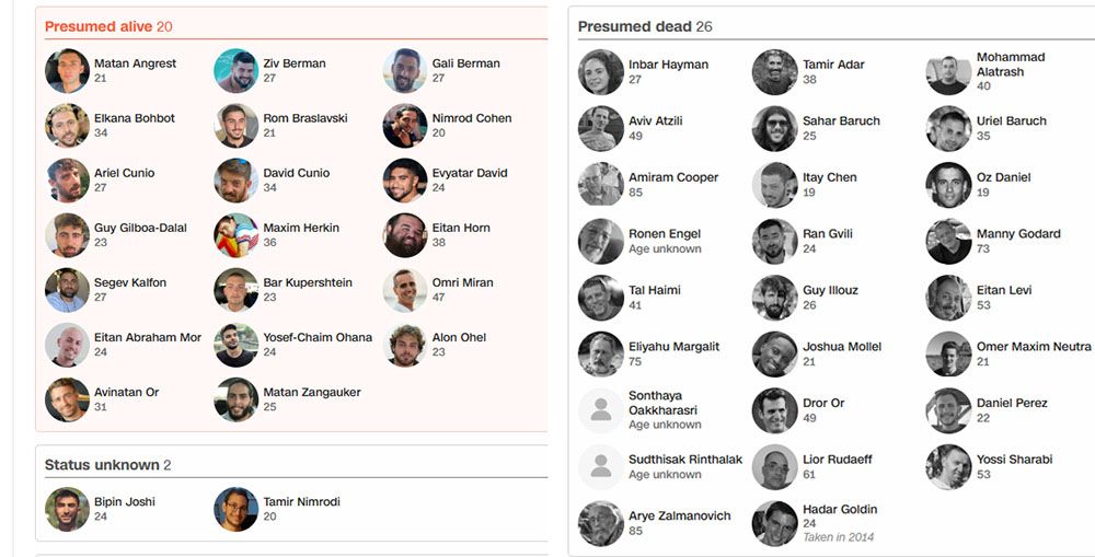 त्यस्तै नेपालका विपिन जोशी र इजरायलका सैनिक तामिर निमरोदीको अवस्था अज्ञात रहेको छ । त्यस्तै हमासले बन्धक बनाएका अन्य २६ जनाको मृत्यु भएको छ ।