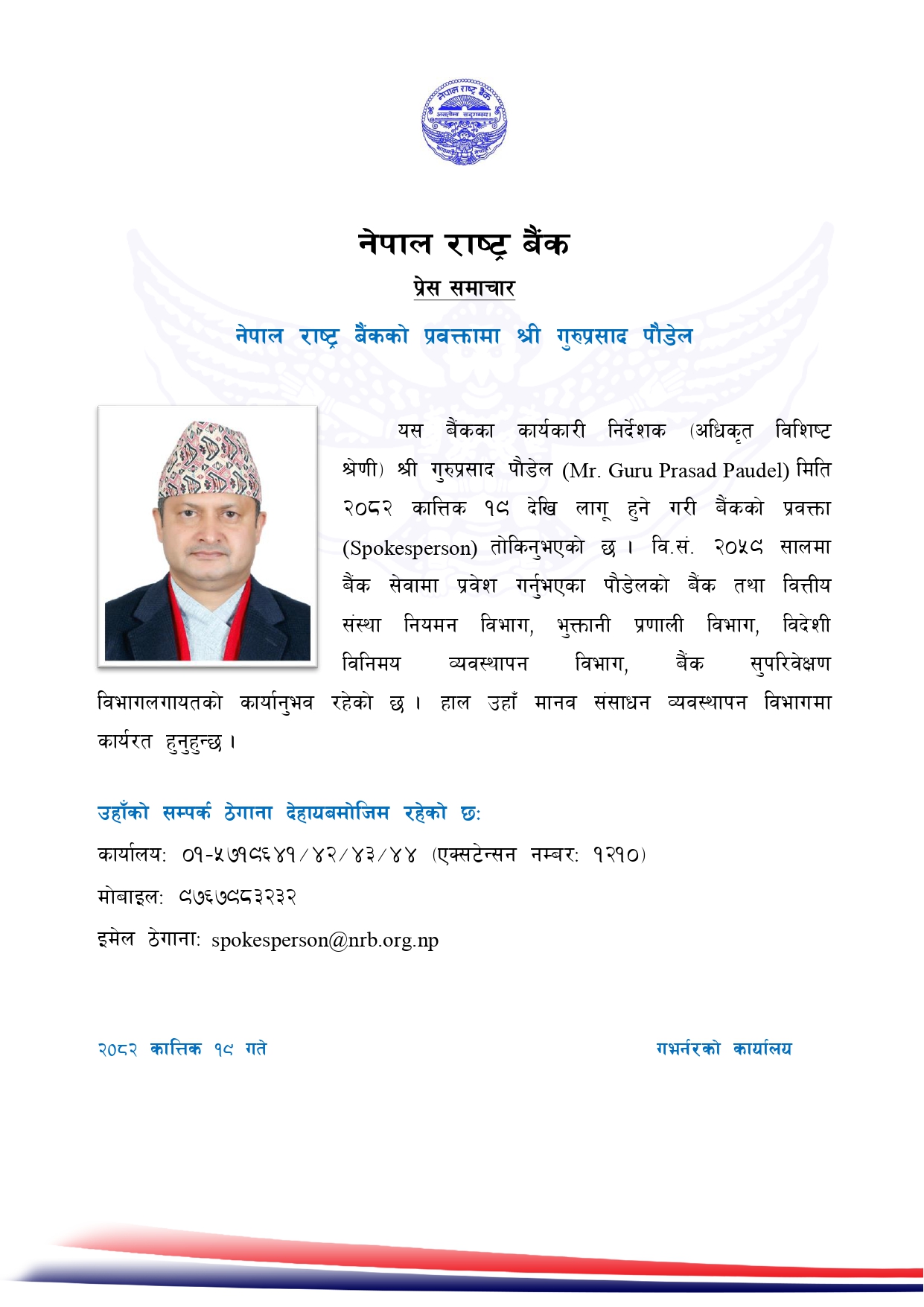 काठमाडौं । नेपाल राष्ट्र बैंकको प्रवक्तामा कार्यकारी निर्देशक गुरुप्रसाद पौडेल आएका छन् । गभर्नर प्रा.डा. विश्वनाथ पौडेलले प्रवक्ताको जिम्मेवारी पौडेललाई दिएका हुन् ।