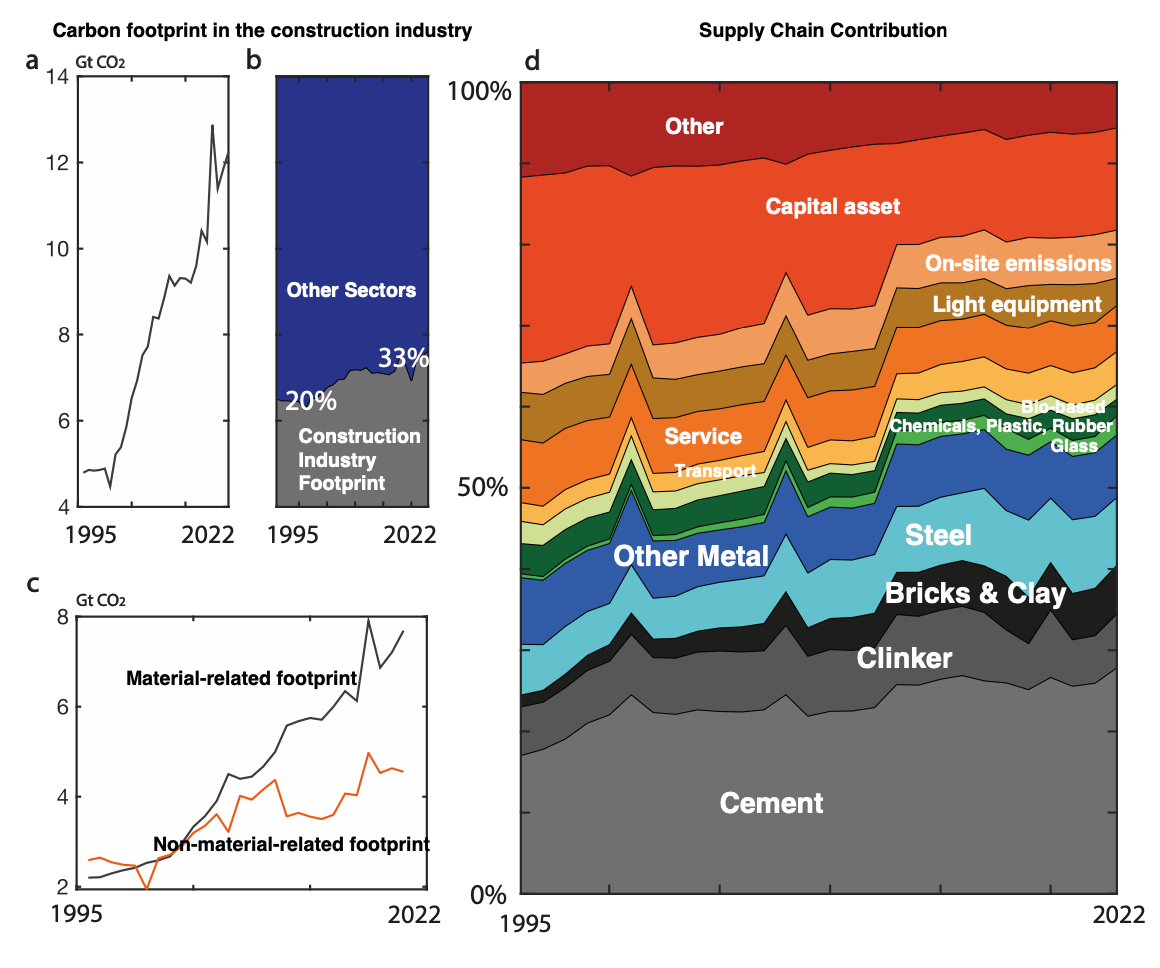 यस अध्ययनका प्रमुख लेखक चाओहुई ली भन्छिन —२०२२ मा, निर्माण उद्योगको ५५ प्रतिशत कार्बन उत्सर्जन सिमेन्ट, इँटा र फलाम जस्ता सामाग्रीबाट आएको पाइयो। ६ प्रतिशत उत्सर्जन गिलास, प्लास्टिक, रासायनिक तथा जैव–आधारित सामाग्रीहरूबाट आएको थियो भने, बाँकी ३७ प्रतिशत यातायात, सेवा, मेसिनरी र निर्माणस्थलका गतिविधिबाट आएको थियो ।