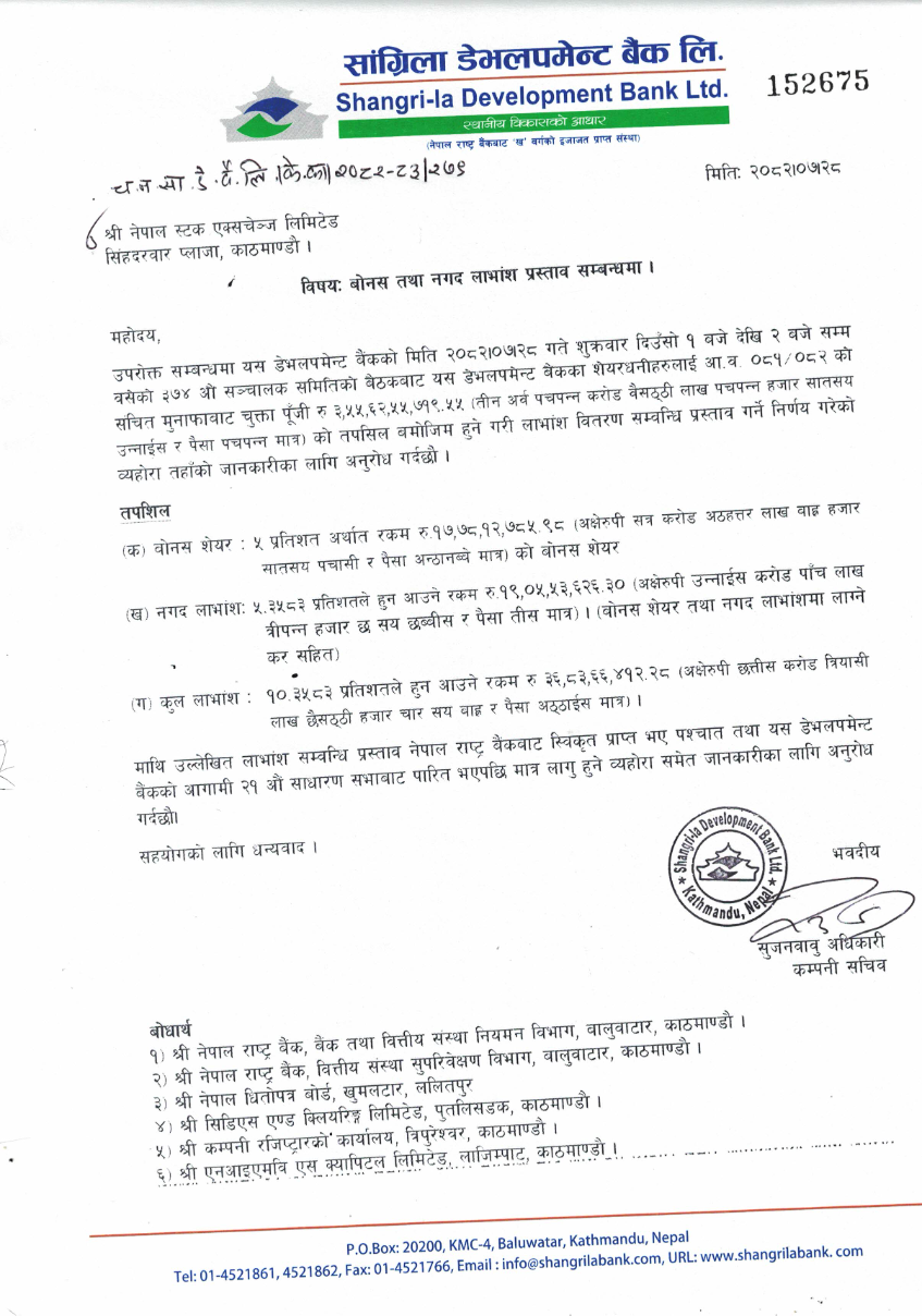 सांग्रिला डेभलपमेन्ट बैंकद्वारा १० प्रतिशत लाभांश घोषणा
