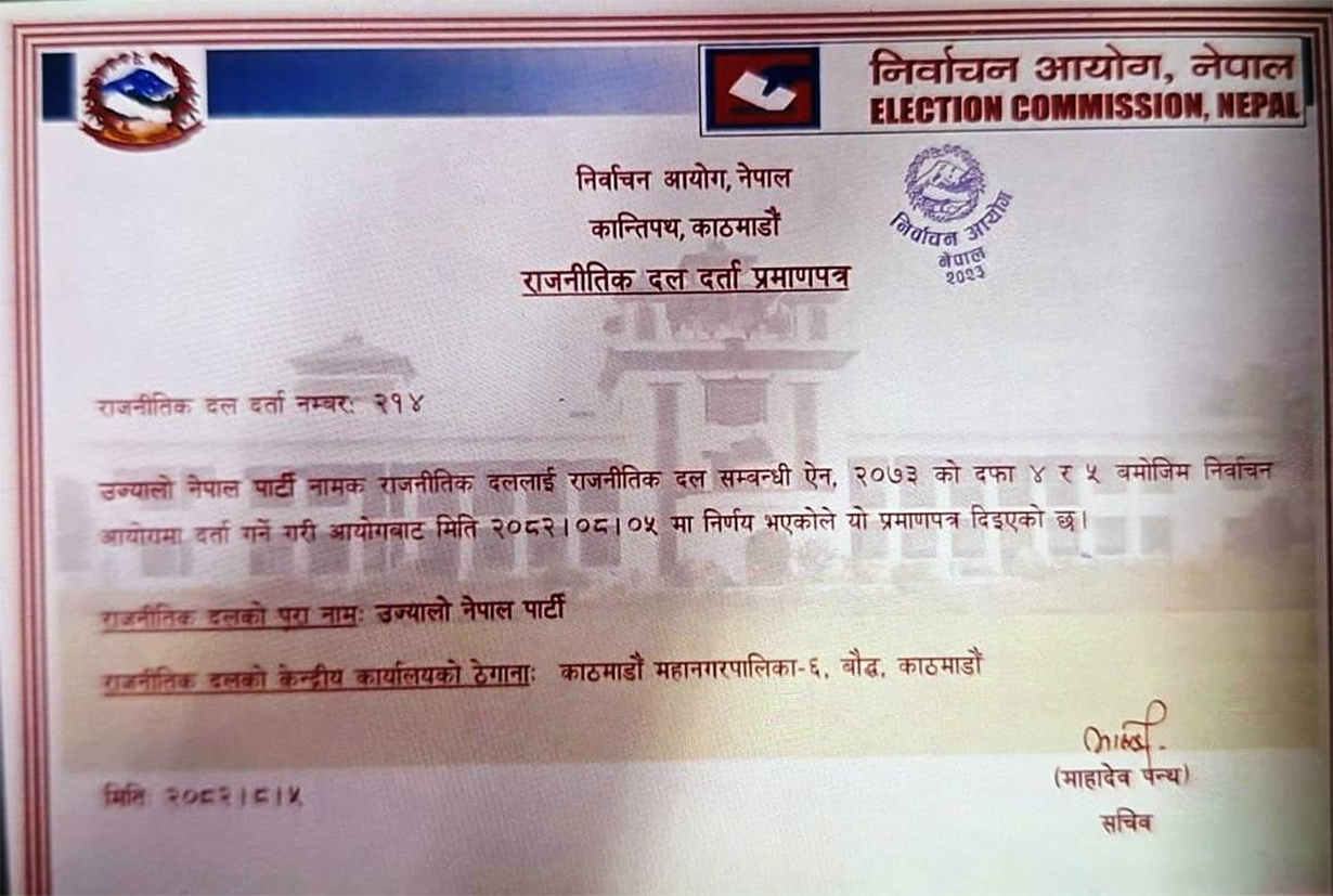उज्यालो नेपाल पार्टीले पायो दल दर्ताको प्रमाणपत्र