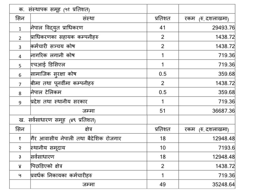 आयोजनाको प्रवर्धक कम्पनीमा प्राधिकरणको ४१ प्रतिशत संस्थापक शेयर अर्थात २९ अर्ब ४९ करोड रुपैयाँको लगानी रहनेछ । १ अर्ब ४४ करोड÷१ अर्ब ४४ करोड (२÷२ प्रतिशत) प्राधिकरणका सहायक कम्पनी, कर्मचारी सञ्चय कोष एवम् बीमा तथा पुनर्बीमा कम्पनीको, ७१ करोड ९३ लाख लाख÷७१ करोड ९३ लाख लाख (१ प्रतिशत) नागरिक लगानी कोष, एचआइडिसिएल, प्रदेश एवम् स्थानीय सरकारको र ३५ करोड ९७ लाख÷३५ करोड ९७ लाख रुपैयाँ (०.५÷०.५ प्रतिशत) नेपाल टेलिकम तथा सामाजिक सुरक्षाको कोषको संस्थापक लगानी रहनेछ ।
