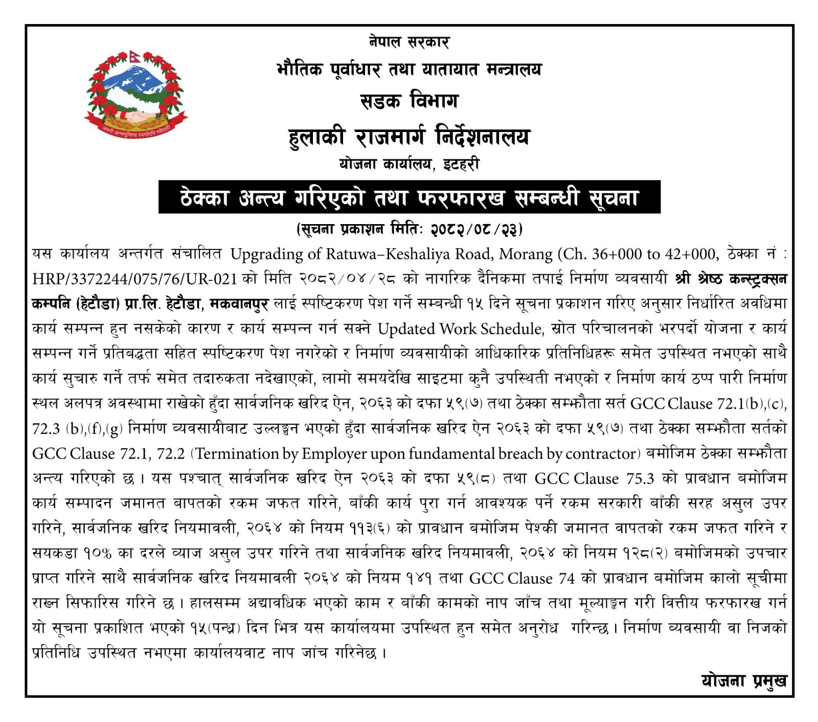 सडक विभाग मातहतको हुलाकी राजमार्ग निर्देशनालयअन्तर्गत योजना कार्यालय इटहरीले मंगलबार सडक निर्माणका लागि श्रेष्ठ कन्स्ट्रक्सन कम्पनी प्रा.लि. हेटौंडासँगको ठेक्का सम्झौता अन्त्य गरिएको सार्वजनिक सूचना जारी गरेको छ ।
