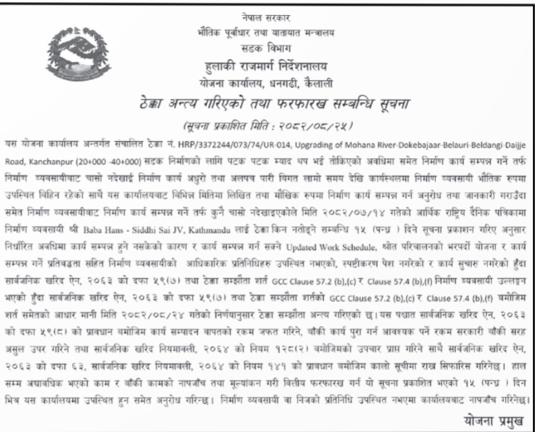 सडक विभाग मातहतको हुलाकी राजमार्ग निर्देशनालयअन्तर्गत योजना कार्यालय धनगढीले बिहीबार सडक निर्माणका लागि बाबा हन्स—सिद्धीसाई संयुक्त उपक्रम (जेभी) काठमाडौंसँगको ठेक्का सम्झौता अन्त्य गरिएको सार्वजनिक सूचना जारी गरेको छ । सडक स्तरोन्नतिका लागि आर्थिक वर्ष २०७३÷७४मा ठेक्का सम्झौता भएको थियो । करिब २० किलोमिटर सडकमध्ये ५ किलोमिटर मात्र कालोपत्रे गर्न बाँकी रहेको छ । निर्माण प्रगति करिब ८२ प्रतिशत रहेको छ ।