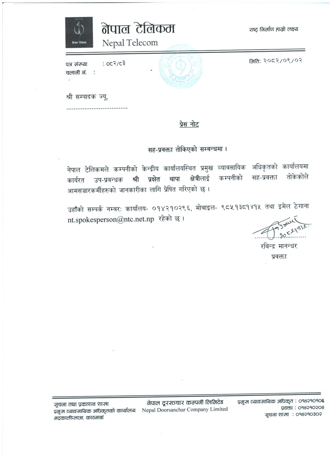 नेपाल टेलिकमले कम्पनीको केन्द्रीय कार्यालयस्थित प्रमुख व्यावसायिक अधिकृतको कार्यालयमा कार्यरत उप-प्रबन्धक क्षेत्रीलाई कम्पनीको सह-प्रवक्ता तोकेको कम्पनीले जानकारी दिएको हो ।