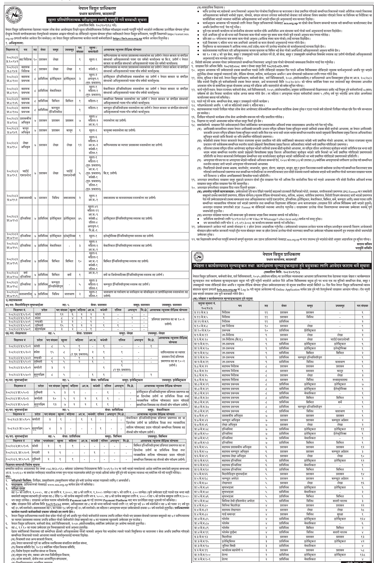 नेपाल विद्युत् प्राधिकरणले ज्येष्ठता र कार्यसम्पादन मूल्यांकन तथा कार्यक्षमता मूल्यांकनबाट हुने बढुवाका लागि पनि विभिन्न पदहरुमा आवेदन फाराम खुलाएको छ ।