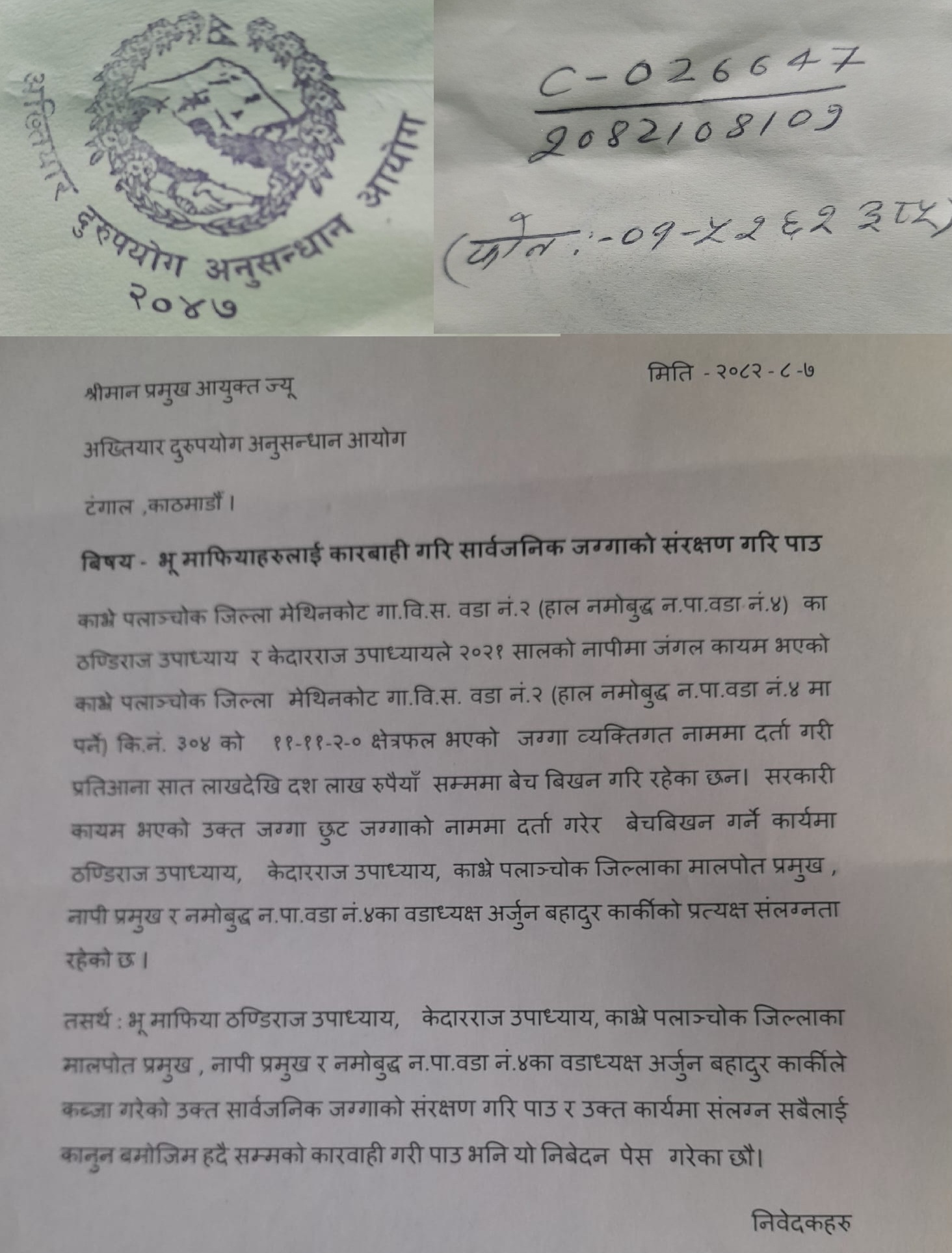 भू माफिया ठण्डिराज उपाध्याय, केदारराज उपाध्याय, काभ्रे पलाञ्चोक जिल्लाका मालपोत प्रमुख , नापी प्रमुख र नमोबुद्ध न.पा.वडा नं.४का वडाध्यक्ष अर्जुन बहादुर कार्कीले कब्जा गरेको उक्त सार्वजनिक जग्गाको संरक्षण गरि पाउ र उक्त कार्यमा संलग्न सबैलाई कानुन बमोजिम हदै सम्मको कारवाही गरी पाउ अख्तियार दुरुपयोग अनुसन्धान आयोगलायतत् सम्बन्धित निकायमा उजुरी गरेको पाइएको छ ।