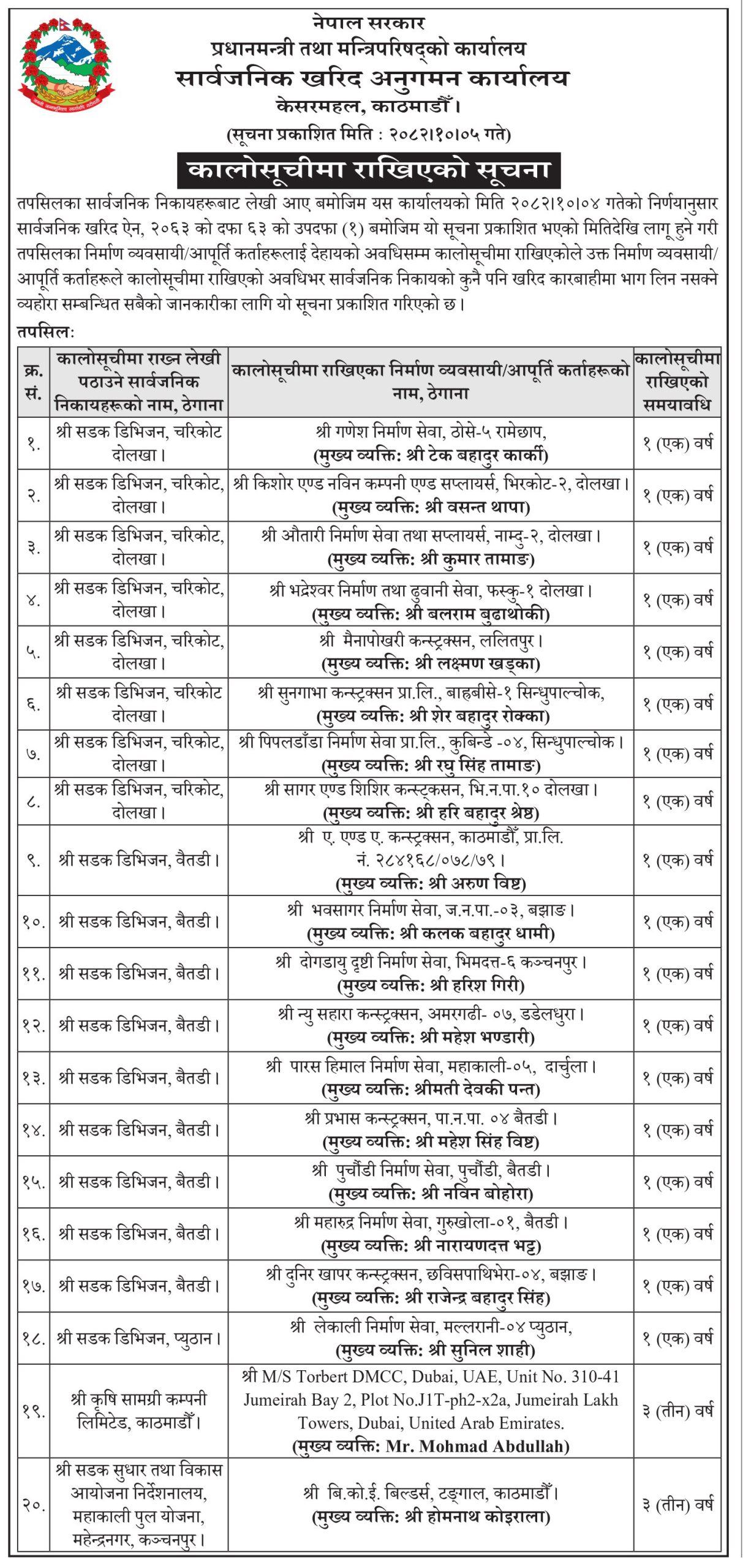 २० निर्माण कम्पनी कालोसूचीमा