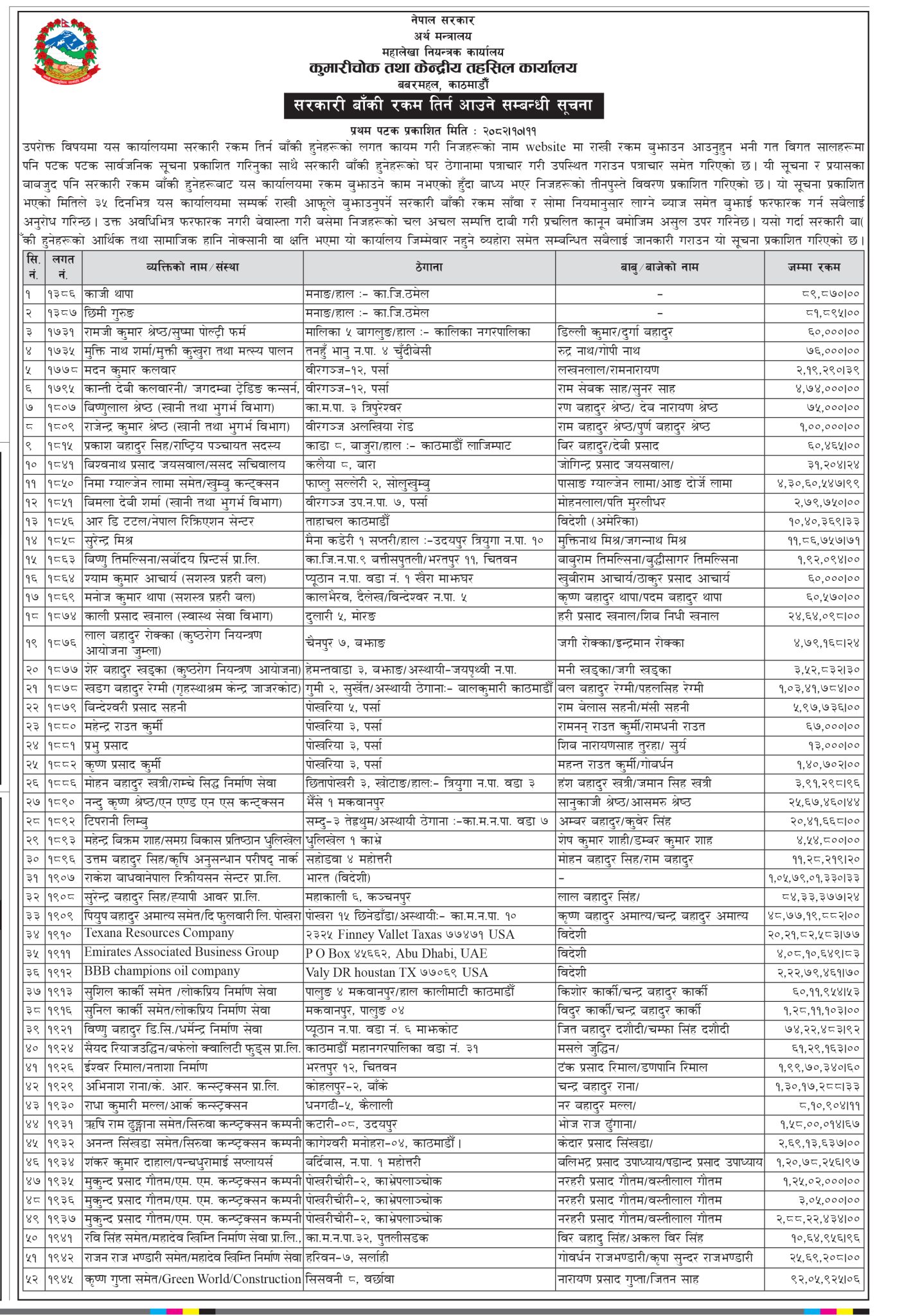 महालेखा नियन्त्रकको कार्यालय अन्तर्गतको कुमारी चोक तथा केन्द्रीय तहसिल कार्यालय बबरमहलले ती व्यक्तिको नाम, ठेगाना र तिर्नुपर्ने रकमसहितको विवरण आज सार्वजनिक गर्दै ३५ दिनभित्र साँवा ब्याज तिर्न निर्देशन दिएको छ । अन्यथा उनीहरुको चल अचल सम्पत्ति दाबी गरी प्रचलित कानुन बमोमिज असुल उपर गर्ने चेतावनी दिइएको छ ।