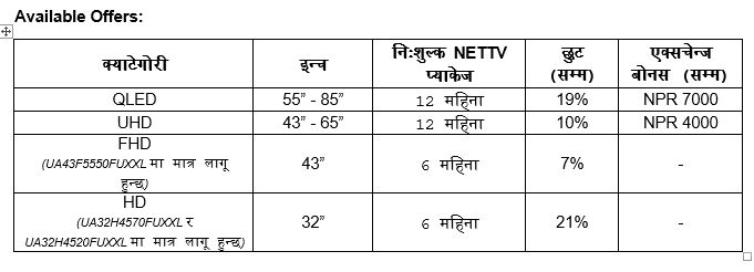 यसका साथै, मनोरन्जनको अनुभवलाई अझ राम्रो बनाउन, सामसङले २०२१ देखि २०२५ सम्म उत्पादन भएका टिभीको खरिद गर्दा आफ्ना ग्राहकहरूलाई रु ३००० सम्मको नि:शुल्क NETTV प्याकेज पनि प्रदान गर्दैछ। QLED र UHD मोडेल किन्दा १२ महिनाको निःशुल्क NETTV सब्स्क्रिप्सन पाइन्छ भने FHD र HD मोडेल किन्दा ६ महिनाको निःशुल्क NETTV सब्स्क्रिप्सन पाइन्छ।