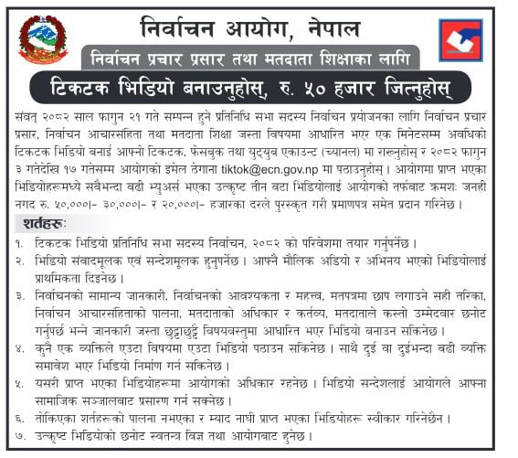 भिडियोमा निर्वाचन प्रचारप्रसार, आचारसंहिता तथा मतदाता शिक्षा जस्ता विषय समावेश हुनुपर्नेछ । एक मिनेटसम्मको भिडियो बनाएर टिकटकका साथै युट्युब र फेसबुकमा पनि राख्नुपर्नेछ । त्यही लिंक फागुन ३ गतेदेखि १७ गतेभित्र आयोगको इमेल tiktok@ecn.gov.np मा पठाउनु पर्नेछ ।