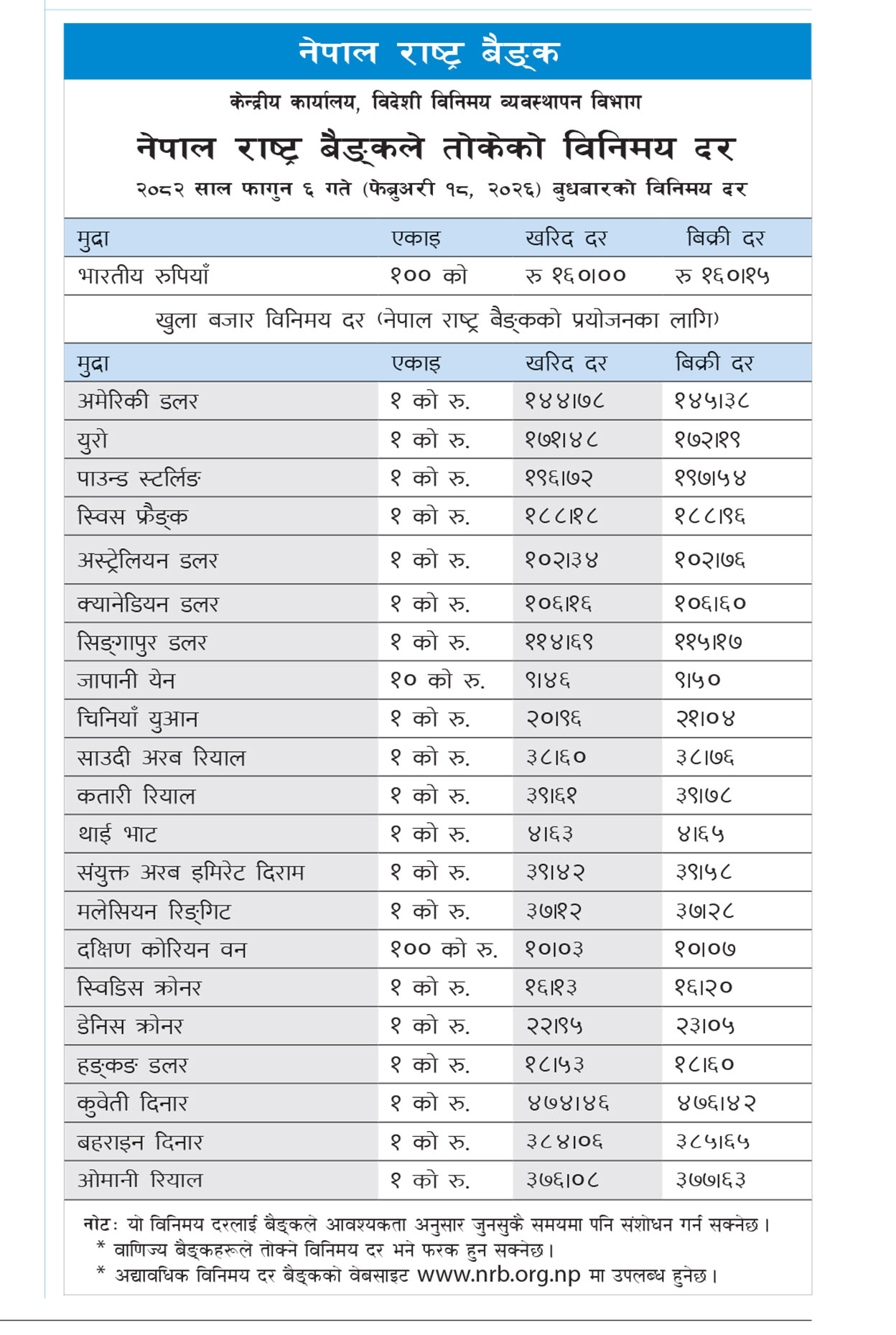 राष्ट्र बैंकले हङकङ डलर एकको खरिददर १८ रुपैयाँ ५३ पैसा र बिक्रीदर १८ रुपैयाँ ६० पैसा, कुवेती दिनार एकको खरिददर ४७४ रुपैयाँ ४६ पैसा र बिक्रीदर ४७६ रुपैयाँ ४२ पैसा, बहराइन दिनार एकको खरिददर ३८४ रुपैयाँ ०६ पैसा र बिक्रीदर ३८५ रुपैयाँ ६५ पैसा, ओमनी रियाल एकको खरिददर ३७६ रुपैयाँ ०८ पैसा र बिक्रीदर ३७७ रुपैयाँ ६३ पैसा रहेको छ । यस्तै,भारतीय रुपैयाँ एक सयको खरिददर १६० रुपैयाँ र बिक्रीदर १६० रुपैयाँ १५ पैसा तोकिएको छ ।