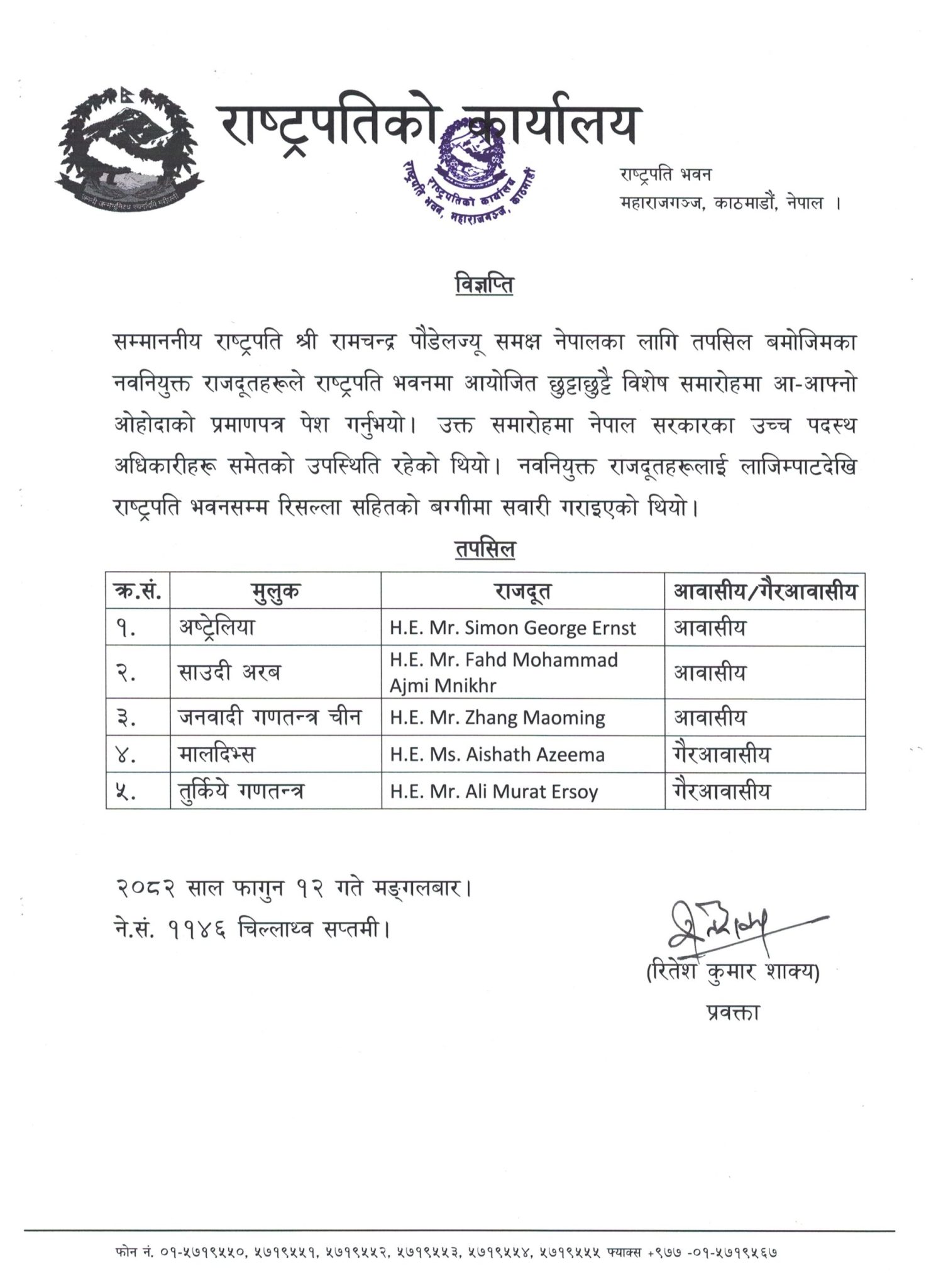 राष्ट्रपति भवन शितलनिवासमा आयोजित समारोहमा राजूतहरूले ओहोदाको प्रमाणपत्र बुझाएका हुन् । राष्ट्रपतिसमक्ष अस्ट्रेलिया, साउदी अरब, चीन, मालदिभ्स, तुर्किये गणतन्त्रका राजदूतले ओहोदाको पत्र बुझाएको राष्ट्रपति कार्यालयका प्रवक्ता रितेशकुमार शाक्यले जानकारी दिए ।