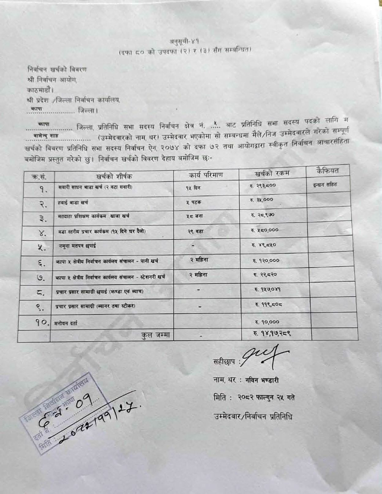 बालेनको निर्वाचन प्रतिनिधि नवीन भण्डारीको हस्ताक्षरमा बुझाइएको विवरणमा समग्रमा १४ लाख १७ हजार २८९ रुपैयाँ खर्च भएको उल्लेख छ ।