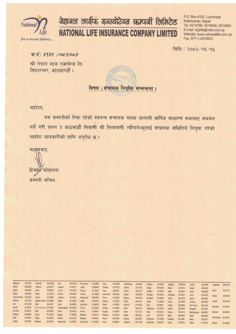 काठमाडौं । नेशनल लाईफ इन्स्योरेन्स कम्पनी लिमिटेडले आफ्नो रिक्त रहेको स्वतन्त्र सञ्चालक पदमा श्री लिलामणि न्यौपानेलाई नियुक्त गरेको छ।